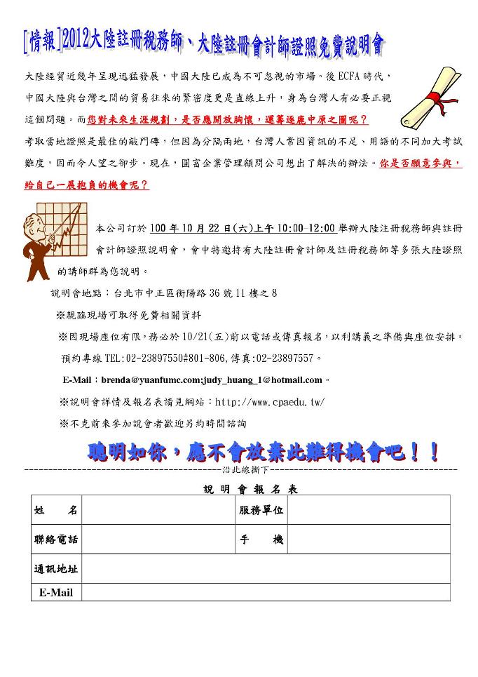 2012大陸註冊會計師與大陸註冊稅務師免費說明會