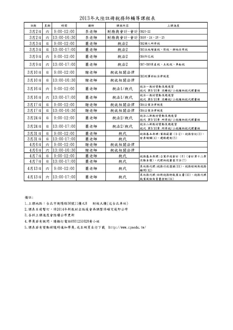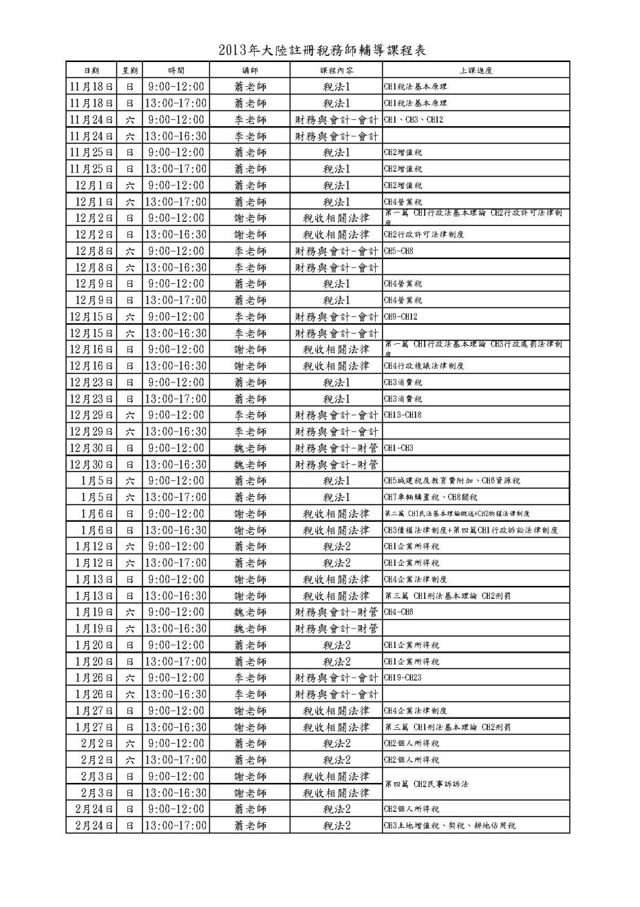 2013年大陸註冊稅務師課表