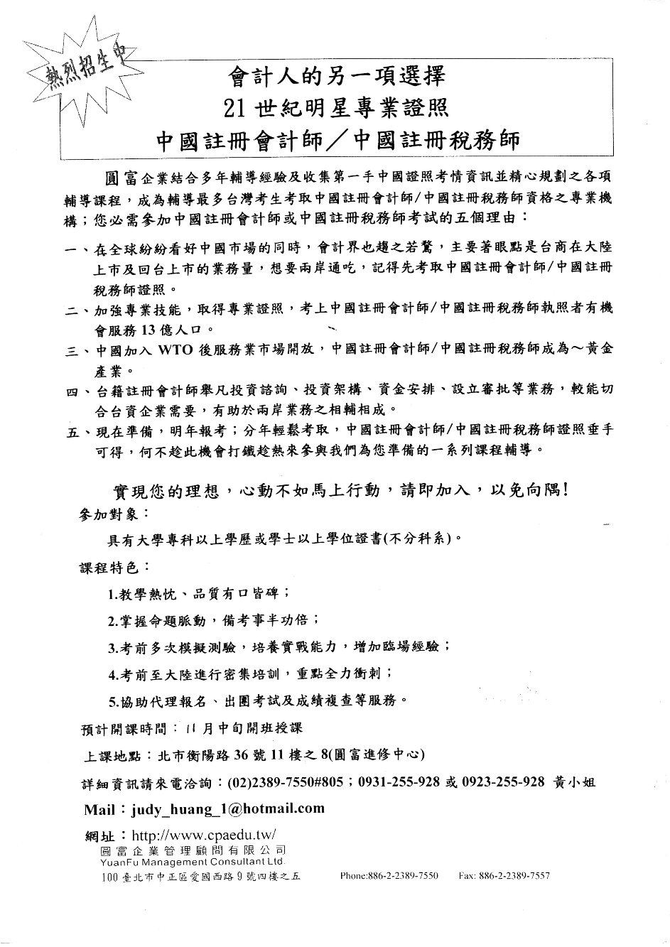 地址:台北市100中正區衡陽路36號8樓之1(衡陽財經大樓) 電話:(02)23897550(代表號) 傳真:(02)23897557
