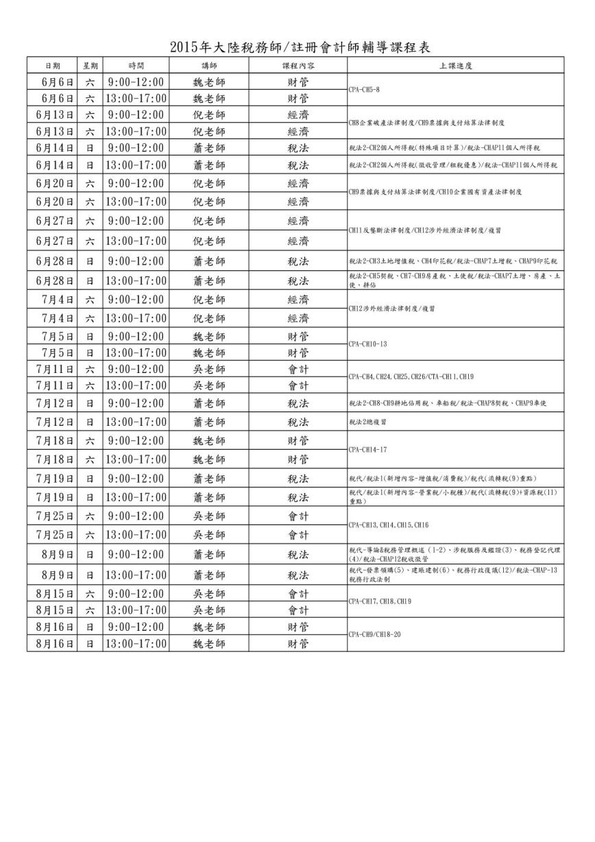 2015中國註冊會師/稅務師課表