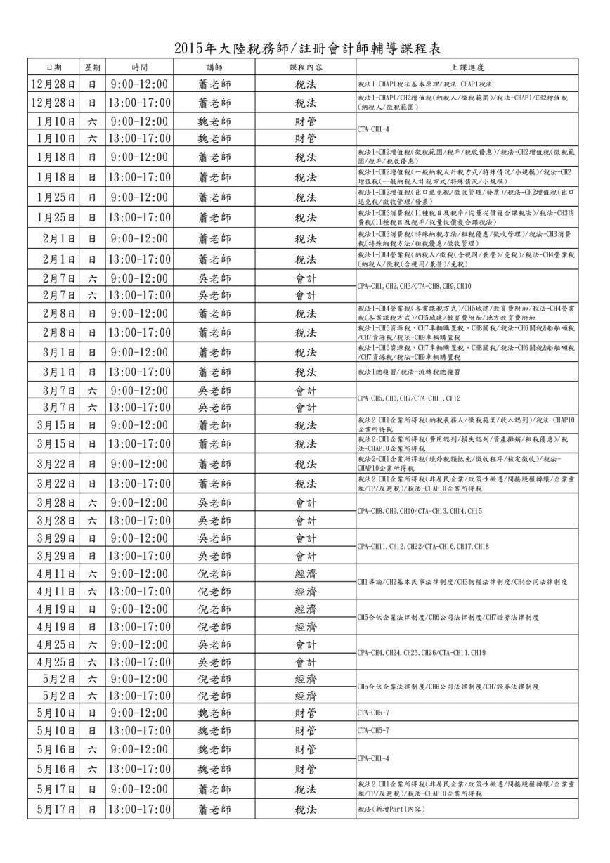2015中國註冊會計師/稅務師課表